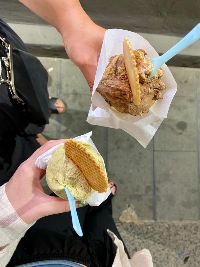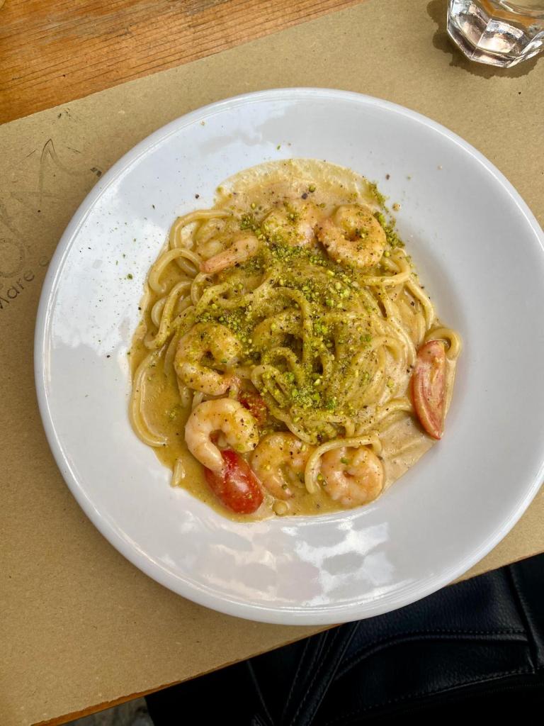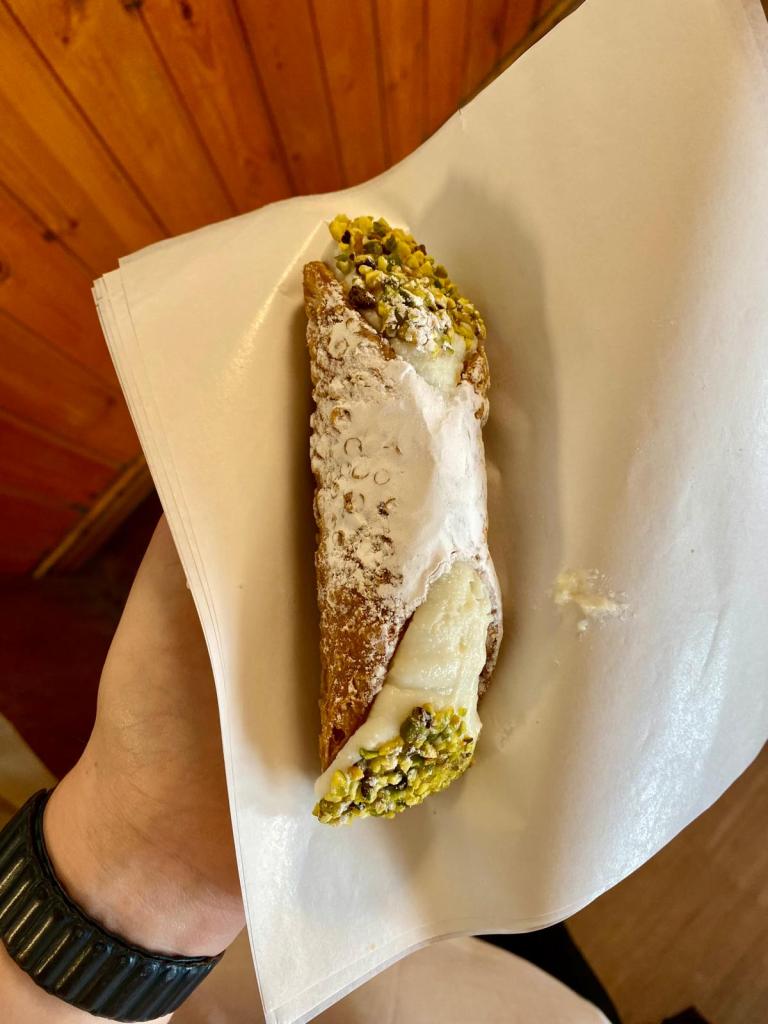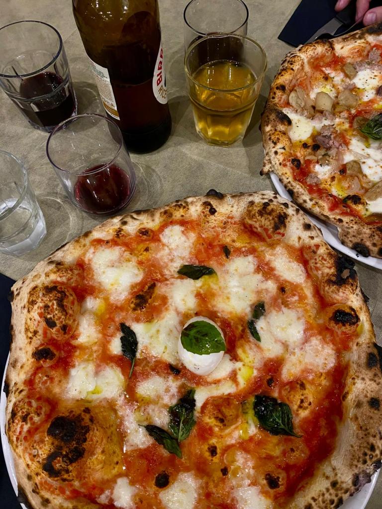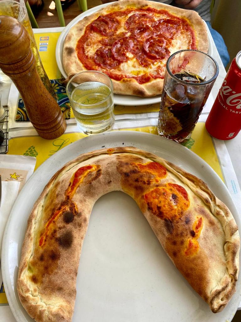 Löysimme sopivan ravintolan, jossa ei kuitenkaan puhuttu englantia. Ruoka sen sijaan oli erinomaista. Pizza oli napolilaistyylistä, ja siinä oli muhkeat reunat ja maukas taikina. Myös muut vierailemamme ravintolat Nicolosissa olivat erinomaisia. Paikallisesta gelateriasta pystyi illallisen jälkeen nappaamaan vielä jälkiruoaksi gelatoa.