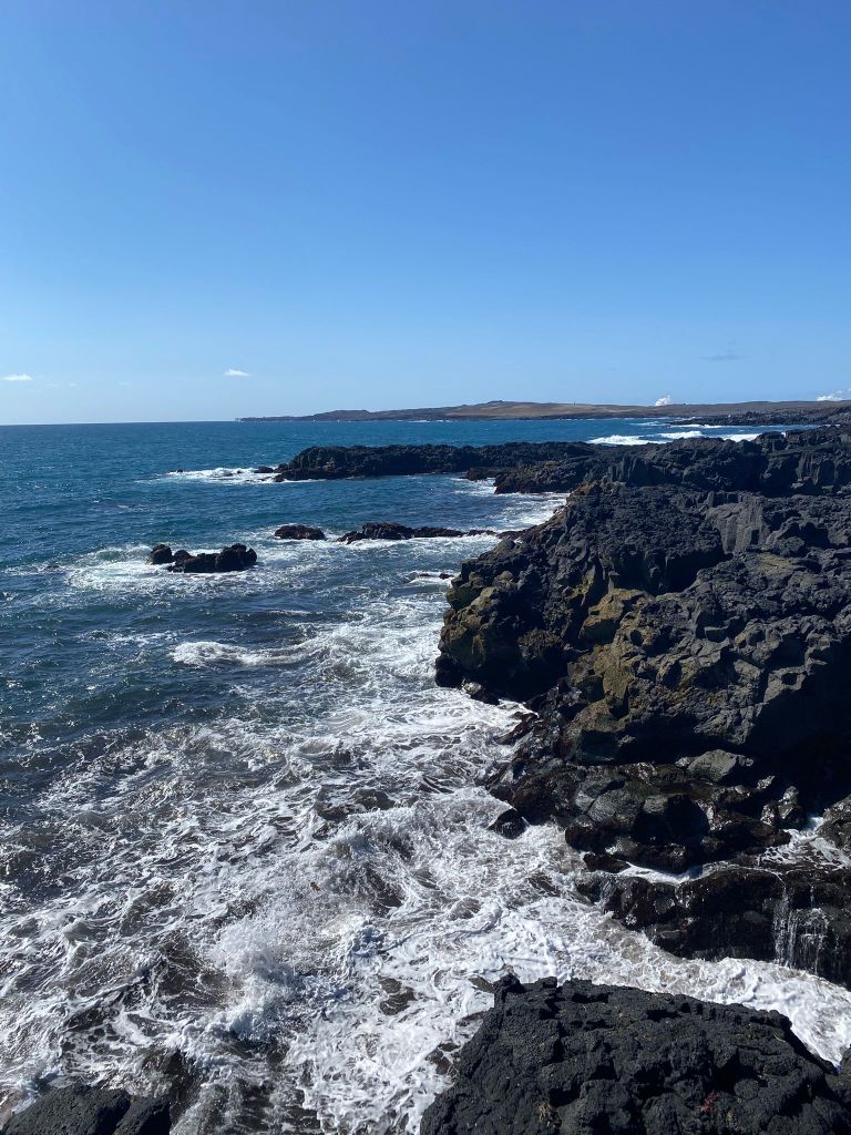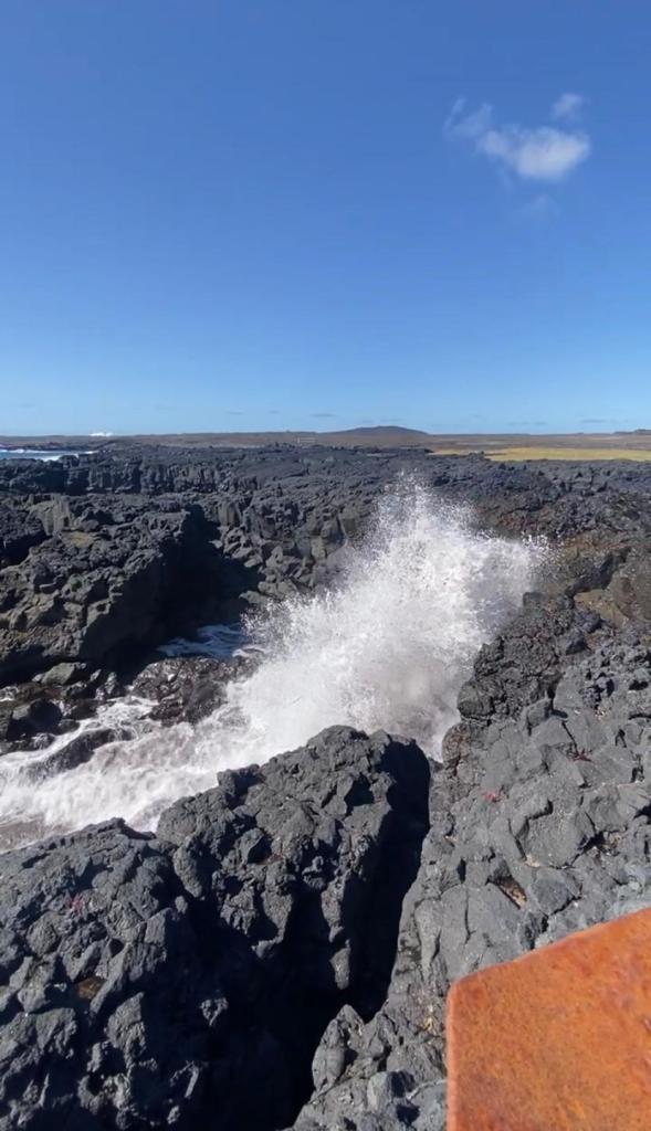 Lähdimme iltapäivällä ajelemaan lentokentän suuntaan, mutta matkalla halusimme käydä vielä katsomassa meren äärellä sijaitsevan luontokohteen nimeltään Brimketill. Brimketill on eräänlainen ”kiviallas”, joka on luonnollisesti muotoutunut allas meressä rannan tuntumassa. Kun aallot vierivät tarpeeksi kovaa allasta kohden, vesi poukkoutuu sen reunoilta monen metrin korkeudelle näköalatasanteelle saakka. Laavasta muotoutuneella rannalla pystyy kävelemään laavakiven päällä, ja näköalapaikalta maisemat ovat upeat rantaviivaa myöden pitkälle merelle.