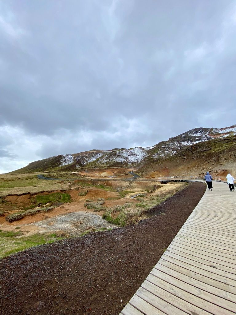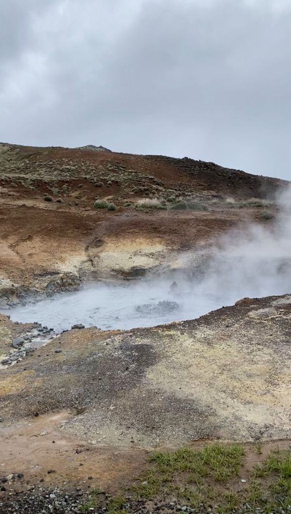 Matkalla Blue Lagoonille kävimme katsomassa Seltúnin geotermistä aluetta. Alueella oli kuplivaa mutaa ja vahva rikin haju, joka ilmeisesti on yleistä kaikilla geotermisillä alueilla. Haju on peräisin joistakin kivien mineraaleista, jotka liukenevat veteen. Alueella olisi päässyt kävelemään pidemmänkin reitin, mutta kävimme vain vilkaisemassa lähettyvillä sijaitsevia kuumia lähteitä. Lisäksi tuuli todella kovaa, noin 13 m / s ja vielä kovemmin puuskissa, joten ilma ei suoranaisesti houkutellut meitä tutkimaan paikkaa sen enempää.