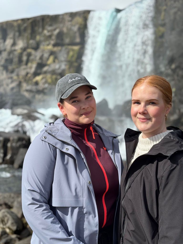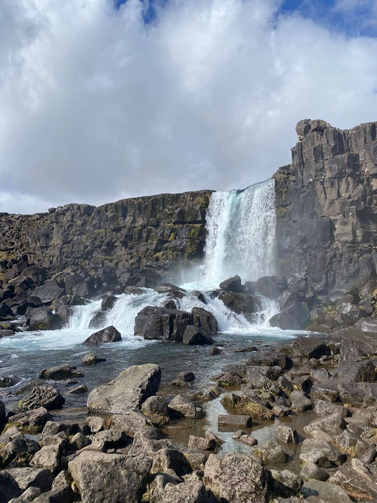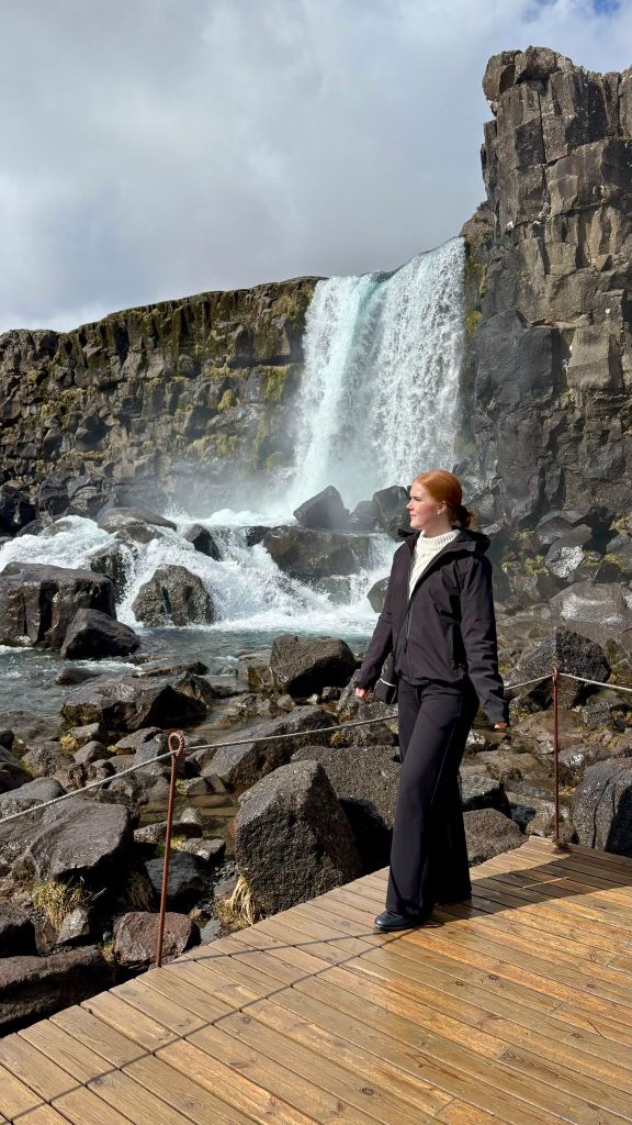 Ensimmäinen kohteemme oli Þingvellirin kansallispuisto. Kansallispuisto sijaitsee Euraasian ja Pohjois-Amerikan mannerlaattojen erkanemispisteessä, jonka vuoksi alueella on mahtavia kivimuodostelmia. Alueella voi patikoida pitkiäkin reittejä, mutta suunnitelmamme oli ehtiä käymään useita kohteita päivän aikana, joten suuntasimme suoraan kansallispuistossa sijaitsevalle Öxarárfossin vesiputoukselle. Kävelymatkaa parkkipaikalta vesiputoukselle on jonkin verran, mutta reitti on helppokulkuista.