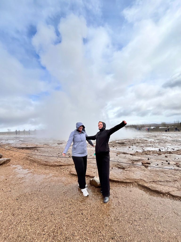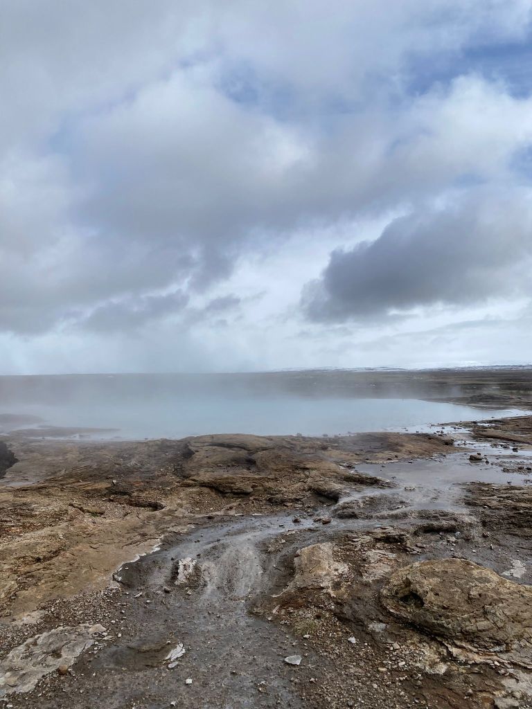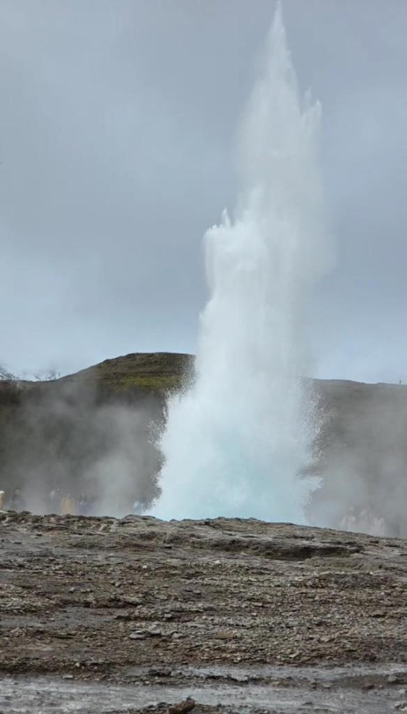 Seuraava kohteemme oli Geysirin geoterminen alue, jossa on maaperästä pulppuavia kuumia lähteitä. Alueen keskeinen kuuma lähde on Geysir, jonka mukaan muut geysirit on nimetty. Se ei ole enää aktiivinen, mutta toinen alueella sijaitseva geysir, nimeltään Strokkur, puolestaan on. Tämän kuuman lähteen ympärys oli täynnä ihmisiä kamerat kädessään valmiina taltiomaan lähteen seuraava purkaus. Katsoimme useita purkauksia, ja ne olivat kyllä uskomattomia ja ainutlaatuisia. Kastuimme kerran jopa melkein läpimäriksi, sillä purkaus oli niin korkea ja aiheutti pienen sateen ympärilleen.