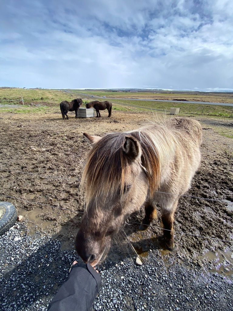 Olin aamusta alkaen jo toivonut näkeväni matkalla hevosia ja muita eläimiä, ja niitä kyllä tulikin pelloilla ja pientareilla vastaan riittämiin. Kuitenkin jatkaessamme matkaa geysireiltä vastaan tuli hevoslaidun, jonka vierestä pystyi ostamaan hevosille herkkuja ja samalla mennä tervehtimään niitä. Heppatyttönä tietenkin ostin kupillisen, ja iloisena syötin herkut islanninhevoselle, joka tervehti kaikkia paikalle pysähtyjiä herkkujen saamisen toivossa.