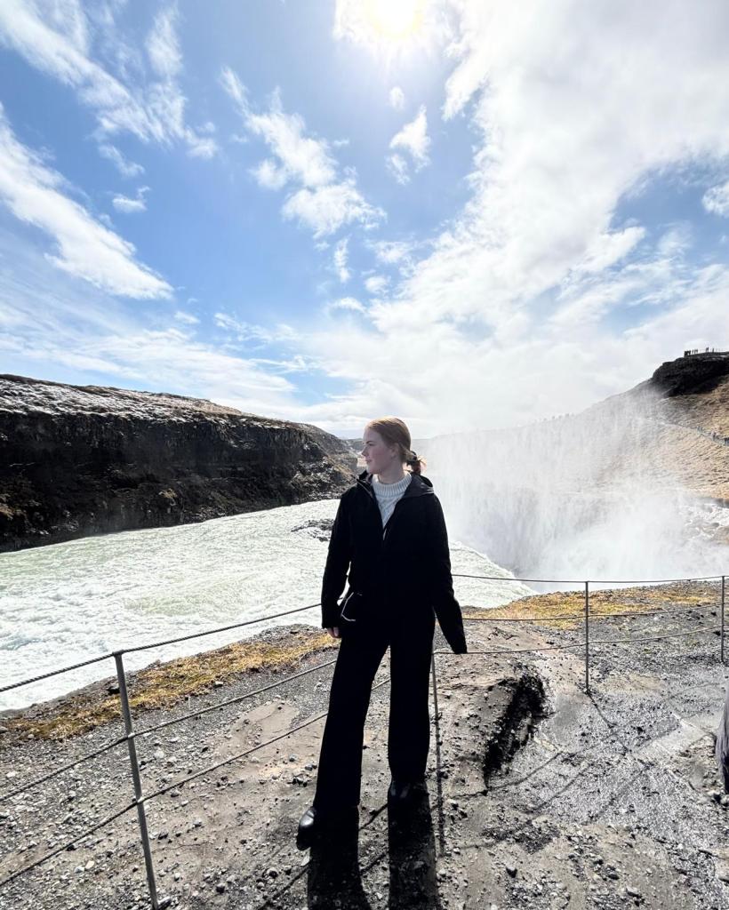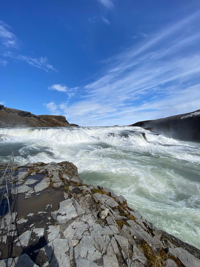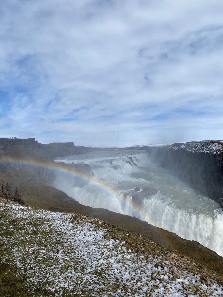Gullfoss toden totta oli melkoinen ilmestys ja upea kaikin puolin. Auringonpaisteessa maisemaan muodostui kirkas sateenkaari kuohuvan veden osuessa säteisiin.