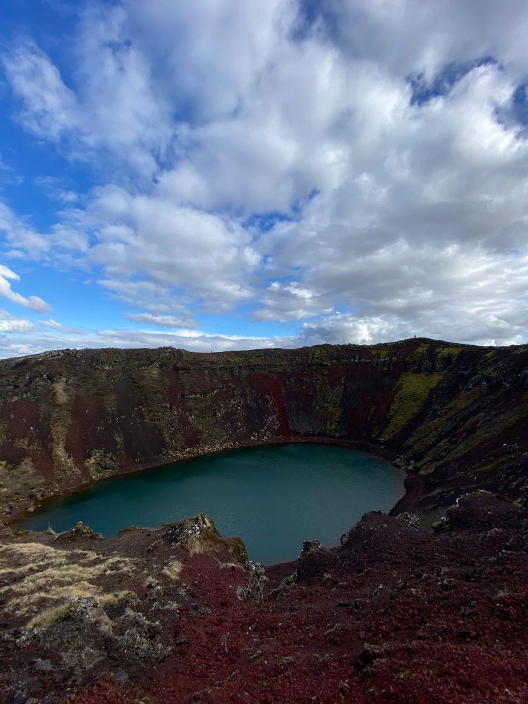 Matkamme jatkui täysin vatsoin kohti päivän viimeistä kohdetta, Keridin kraatteria. Kraatteri on noin 6000–7000 vuotta sitten romahtanut tulivuori, jonka jälkeen paikalle muodostui vulkaaninen ”järvi”. Tämä oli päivän ainoa maksullinen kohde, joka sekin maksoi aikuiselta vain vaivaiset neljä euroa. Parkkipaikka oli aivan kraatterin läheisyydessä, joten kävelymatkaa ei juuri ollut. Kraatteri oli kyllä melkoinen ilmestys, ja ehkä jopa mielestäni päivän kaunein kohde. Veden sininen väri ja seinämien punaiset värit yhdessä loivat kauniin kontrastin.