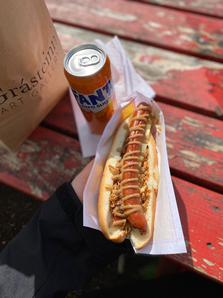 Kävelimme takaisin keskustaan uusia reittejä pitkin samalla vieraillen kaikissa mahdollisissa matkamuistomyymälöissä etsien sopivia tuliaisia ja magneetteja. Tiemme tuli päätökseen jälleen Hallgrímskirkjalla, jonka läheisyydessä oli suosittu hotdog-kioski. Olin etukäteen tutkinut, että Reykjavíkin hotdogit, erityisesti tämän kioskin hotdogit olisivat erinomaisia ja niitä olisi pakko kokeilla ollessaan kaupungissa. Saatavilla oli muutamaa erilaista hodaria, mutta itse söin perinteisen version. Olihan se hyvää, mutta ei mielestäni mitenkään erikoista. Tulipahan ainakin koettua tuo jokseenkin kuuluisa hodari.