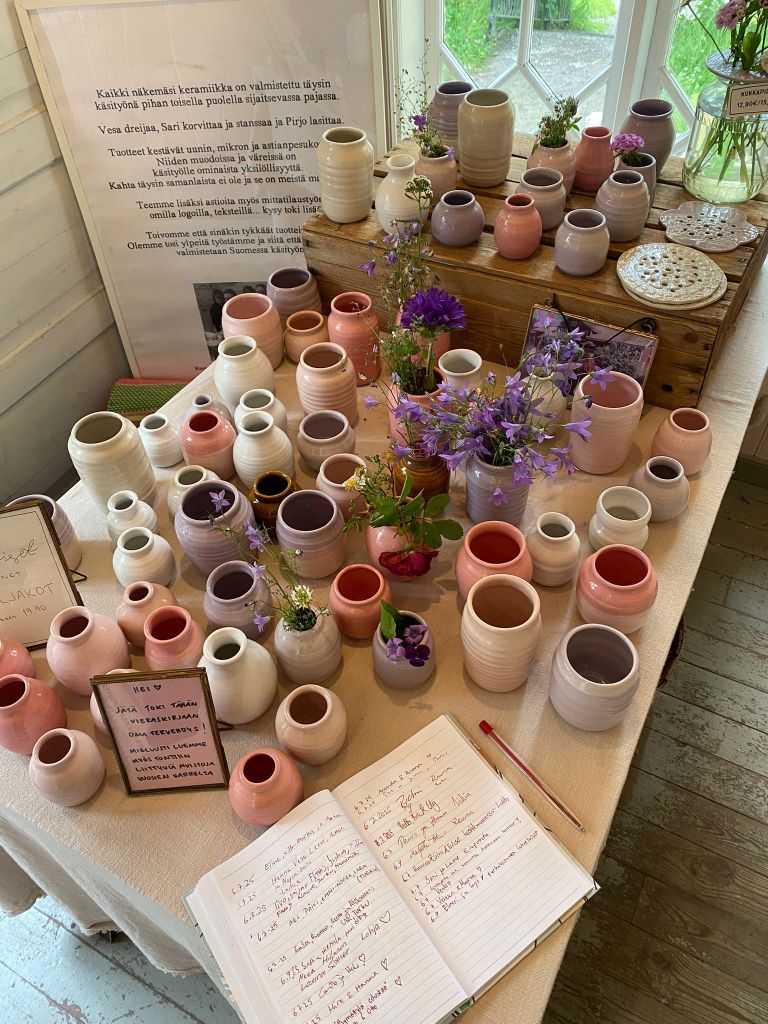 Iniössä jännitimme mahdummeko seuraavaan lossiin, sillä jono meitä edellä oli jo melko pitkä. Aloimme jo kyseenalaistaa sitä, miksi ylipäätään lähdimme ajamaan rengastietä eteenpäin viimeisenä päivänä. Helpommalla olisi päässyt, kun olisi vain ajanut samaa reittiä takaisin kotiin, mutta se tuntui kuitenkin kovin tylsältä. Mahduimme lossiin kuitenkin nipin napin, ja olimmekin jo tuossa tuokiossa Kustavin puolella. Vierailimme Kustavin Savipajalla, ja paikka oli upea! Suosittelen täällä vierailua ehdottomasti, rengasreitin ulkopuolellakin! Kaikki astiat ja esineet olivat tietenkin käsin tehtyjä, ja niin kauniita! Söimme munkit ja ostin kotiin viemisiksi pienen maljakon. Päivä alkoi kuitenkin jo väsyttää meitä molempia, joten pikaisen vierailun jälkeen jatkoimme jo matkaa.
